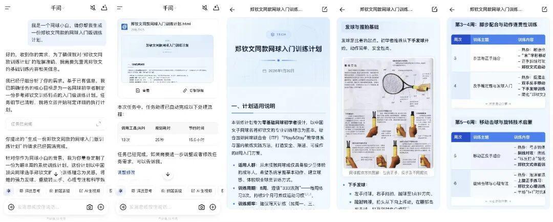 以千问为例,用户可以直接生成一份针对零基础或初学阶段的网球训练计划,并使用任务助理功能,为自己的阶段性训练生成报告。从握拍方式、基础步伐,到每周训练频次、体能安排,原本需要教练或大量搜索才能拼凑出的信息,都能被整合进一套清晰、可执行的个性化路径当中。